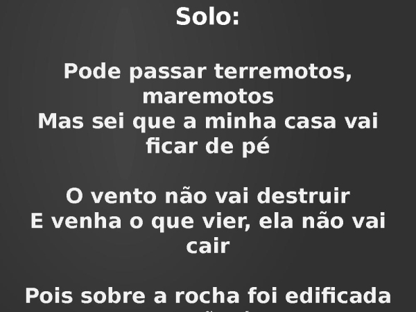 - Pode passar terremotos, maremotosMas sei que a minha casa vai ficar de péO vento não vai destruirE venha o que vier, ela não vai cairPois sobre a rocha foi edificadaA minha proteção é Jesus quem me guardaSolo: