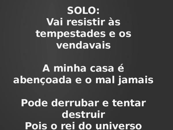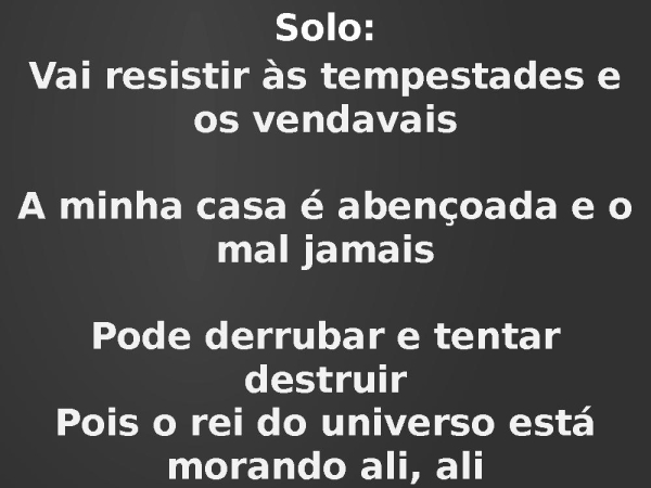 - SOLO:Vai resistir às tempestades e os vendavaisA minha casa é abençoada e o mal jamaisPode derrubar e tentar destruirPois o rei do universo está morando ali, ali
