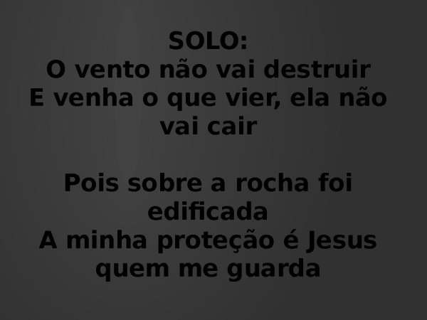 - SOLO:O vento não vai destruirE venha o que vier, ela não vai cairPois sobre a rocha foi edificadaA minha proteção é Jesus quem me guarda
