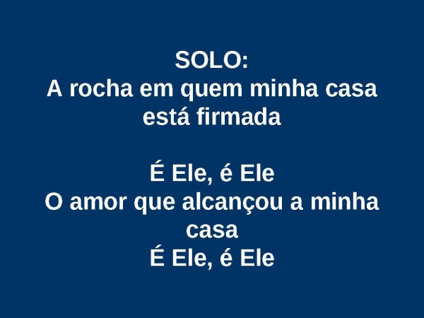 - SOLO:A rocha em quem minha casa está firmadaÉ Ele, é EleO amor que alcançou a minha casaÉ Ele, é Ele