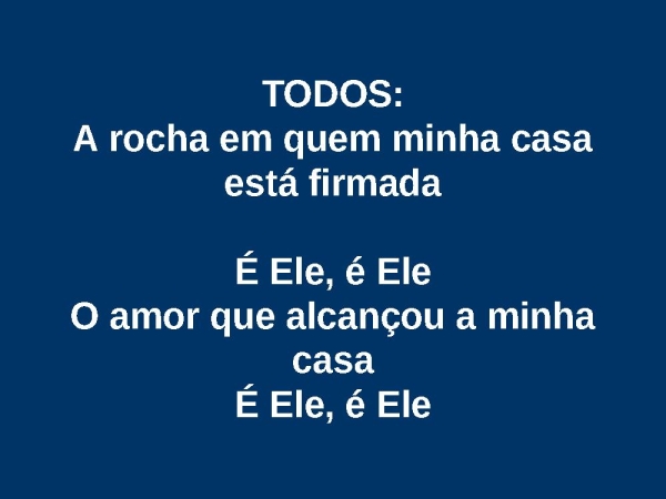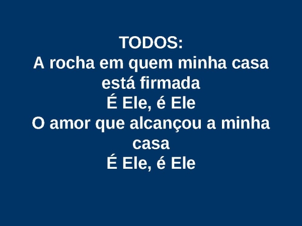 - TODOS:A rocha em quem minha casa está firmadaÉ Ele, é EleO amor que alcançou a minha casaÉ Ele, é Ele