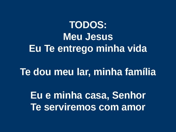 - TODOS:Meu JesusEu Te entrego minha vida Te dou meu lar, minha famíliaEu e minha casa, SenhorTe serviremos com amor