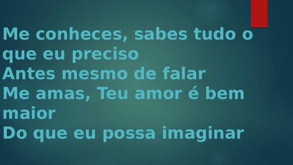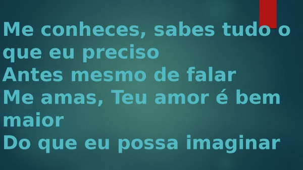 - Me conheces, sabes tudo o que eu preciso Antes mesmo de falar Me amas, Teu amor é bem maior Do que eu possa imaginar