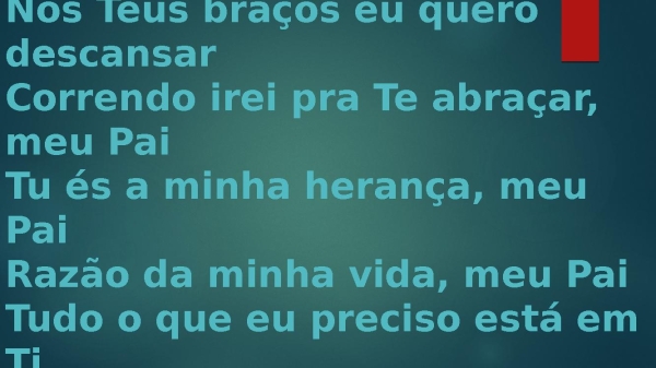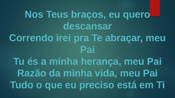 - Nos Teus braços, eu quero descansarCorrendo irei pra Te abraçar, meu PaiTu és a minha herança, meu PaiRazão da minha vida, meu PaiTudo o que eu preciso está em Ti
