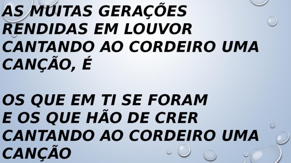 - As muitas gerações Rendidas em louvor Cantando ao Cordeiro uma canção, é Os que em Ti se foram E os que hão de crer Cantando ao Cordeiro uma canção