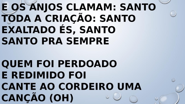 - E os anjos clamam: Santo Toda a criação: Santo Exaltado És, Santo Santo pra sempre Quem foi perdoado E redimido foi Cante ao Cordeiro uma canção (oh)
