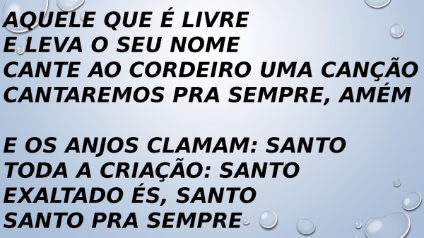 - Aquele que é livre E leva o Seu nome Cante ao Cordeiro uma canção Cantaremos pra sempre, amém E os anjos clamam: Santo Toda a criação: Santo Exaltado És, Santo Santo pra sempre
