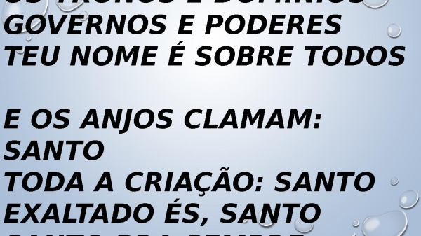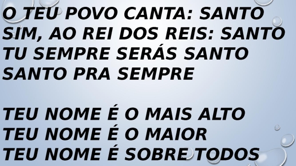 - O Teu povo canta: Santo Sim, ao Rei dos reis: Santo Tu sempre serás Santo Santo pra sempre Teu nome é o mais alto Teu nome é o maior Teu nome é sobre todos