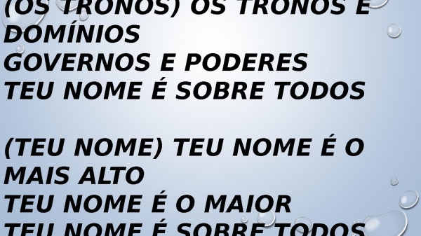 - (Os tronos) os tronos e domínios Governos e poderes Teu nome é sobre todos (Teu nome) Teu nome é o mais alto Teu nome é o maior Teu nome é sobre todos