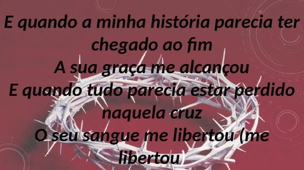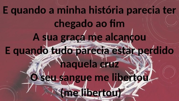 - E quando a minha história parecia ter chegado ao fimA sua graça me alcançouE quando tudo parecia estar perdido naquela cruzO seu sangue me libertou (me libertou)