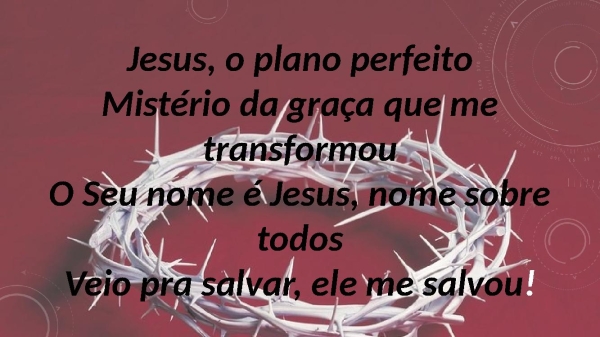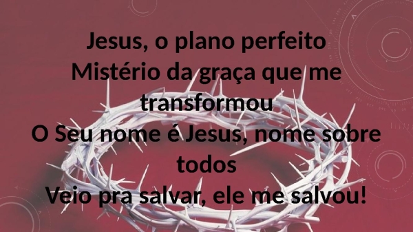- Jesus, o plano perfeitoMistério da graça que me transformouO Seu nome é Jesus, nome sobre todosVeio pra salvar, ele me salvou!
