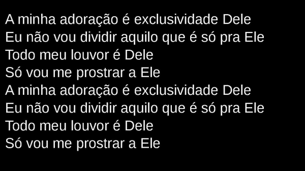 - A minha adoração é exclusividade DeleEu não vou dividir aquilo que é só pra EleTodo o meu louvor é DeleSó vou me prostrar a EleA minha adoração é exclusividade DeleEu não vou dividir aquilo que é só pra EleTodo meu louvor é DeleSó vou me prostrar a Ele