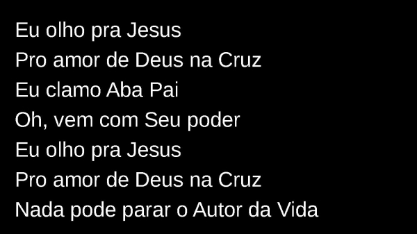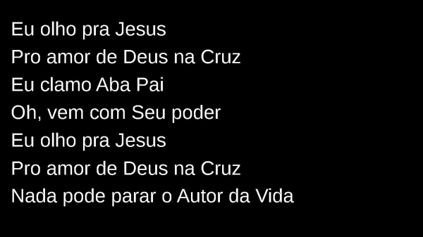 - Eu olho pra JesusPro amor de Deus na CruzEu clamo Aba PaiOh, vem com Seu poderEu olho pra JesusPro amor de Deus na CruzNada pode parar o Autor da Vida