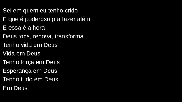 - Sei em quem eu tenho cridoE que é poderoso pra fazer alémE essa é a horaDeus toca, renova, transformaTenho vida em DeusVida em DeusTenho força em DeusEsperança em DeusTenho tudo em DeusEm Deus