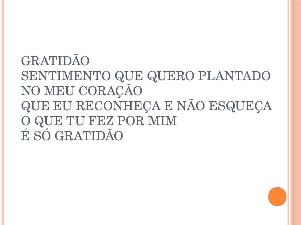 - GratidãoSentimento que quero plantado no meu coraçãoQue eu reconheça e não esqueça o que tu fez por mimÉ só gratidão