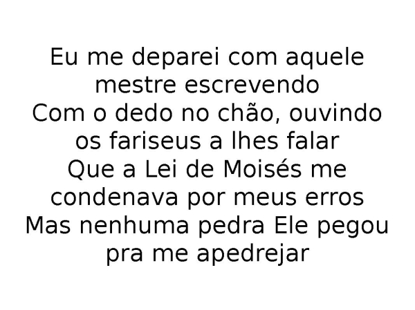 - Eu me deparei com aquele mestre escrevendoCom o dedo no chão, ouvindo os fariseus a lhes falarQue a Lei de Moisés me condenava por meus errosMas nenhuma pedra Ele pegou pra me apedrejar