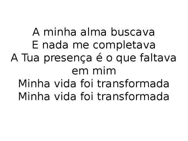 - A minha alma buscavaE nada me completavaA Tua presença é o que faltava em mimMinha vida foi transformadaMinha vida foi transformada