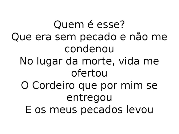 - Quem é esse?Que era sem pecado e não me condenouNo lugar da morte, vida me ofertouO Cordeiro que por mim se entregouE os meus pecados levou