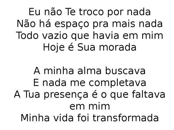 - Eu não Te troco por nadaNão há espaço pra mais nadaTodo vazio que havia em mimHoje é Sua moradaA minha alma buscavaE nada me completavaA Tua presença é o que faltava em mimMinha vida foi transformada