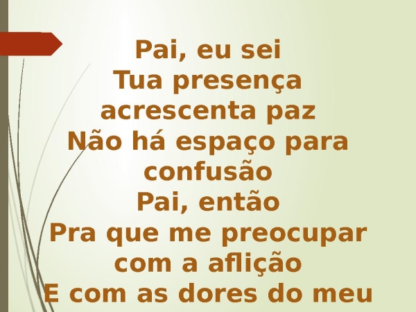 - Pai, eu seiTua presença acrescenta pazNão há espaço para confusãoPai, entãoPra que me preocupar com a afliçãoE com as dores do meu coração?