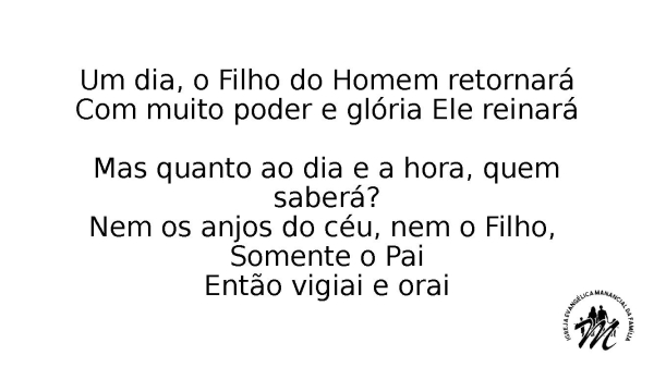 - Um dia, o Filho do Homem retornaráCom muito poder e glória Ele reinaráMas quanto ao dia e a hora, quem saberá?Nem os anjos do céu, nem o Filho, Somente o PaiEntão vigiai e orai