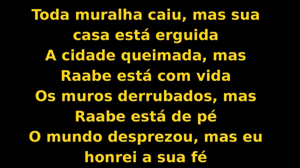 - Toda muralha caiu, mas sua casa está erguidaA cidade queimada, mas Raabe está com vidaOs muros derrubados, mas Raabe está de péO mundo desprezou, mas eu honrei a sua fé