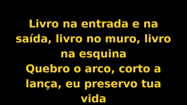 - Livro na entrada e na saída, livro no muro, livro na esquinaQuebro o arco, corto a lança, eu preservo tua vida