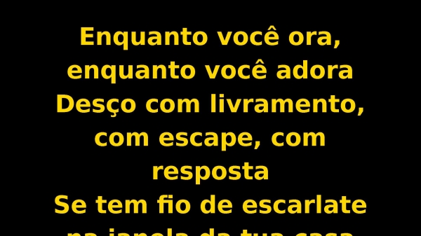 - Enquanto você ora, enquanto você adoraDesço com livramento, com escape, com respostaSe tem fio de escarlate na janela da tua casa