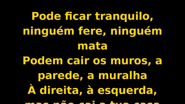 - Pode ficar tranquilo, ninguém fere, ninguém mataPodem cair os muros, a parede, a muralhaÀ direita, à esquerda, mas não cai a tua casa