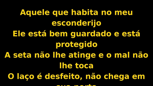 - Aquele que habita no meu esconderijoEle está bem guardado e está protegidoA seta não lhe atinge e o mal não lhe tocaO laço é desfeito, não chega em sua porta