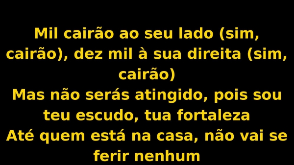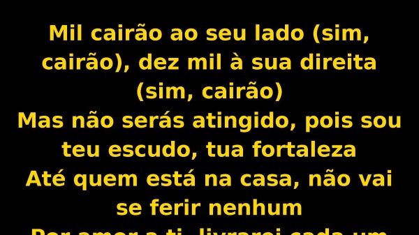 - Mil cairão ao seu lado (sim, cairão), dez mil à sua direita (sim, cairão)Mas não serás atingido, pois sou teu escudo, tua fortalezaAté quem está na casa, não vai se ferir nenhumPor amor a ti, livrarei cada um