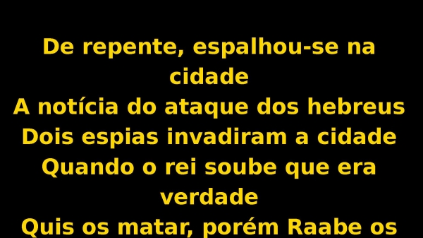 - De repente, espalhou-se na cidadeA notícia do ataque dos hebreusDois espias invadiram a cidadeQuando o rei soube que era verdadeQuis os matar, porém Raabe os escondeu