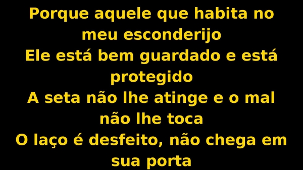 - Porque aquele que habita no meu esconderijoEle está bem guardado e está protegidoA seta não lhe atinge e o mal não lhe tocaO laço é desfeito, não chega em sua porta