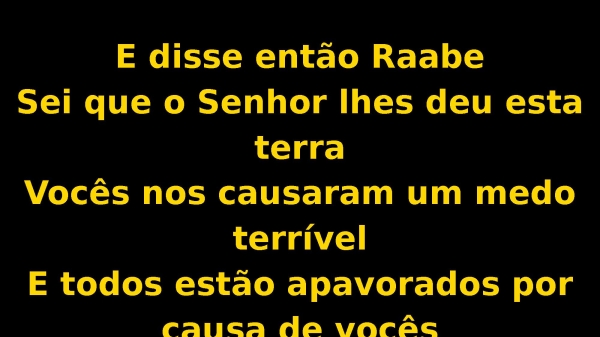 - E disse então RaabeSei que o Senhor lhes deu esta terraVocês nos causaram um medo terrívelE todos estão apavorados por causa de vocês
