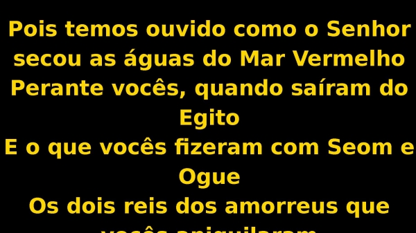 - Pois temos ouvido como o Senhor secou as águas do Mar VermelhoPerante vocês, quando saíram do EgitoE o que vocês fizeram com Seom e OgueOs dois reis dos amorreus que vocês aniquilaram