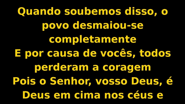 - Quando soubemos disso, o povo desmaiou-se completamenteE por causa de vocês, todos perderam a coragemPois o Senhor, vosso Deus, é Deus em cima nos céus e embaixo na terra