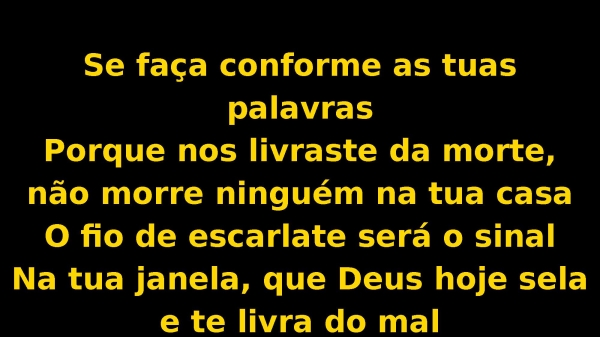 - Se faça conforme as tuas palavrasPorque nos livraste da morte, não morre ninguém na tua casaO fio de escarlate será o sinalNa tua janela, que Deus hoje sela e te livra do mal