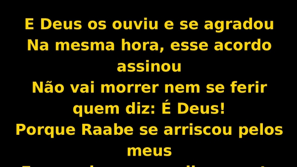 - E Deus os ouviu e se agradouNa mesma hora, esse acordo assinouNão vai morrer nem se ferir quem diz: É Deus!Porque Raabe se arriscou pelos meusEu vou descer com livramento pelos seus!