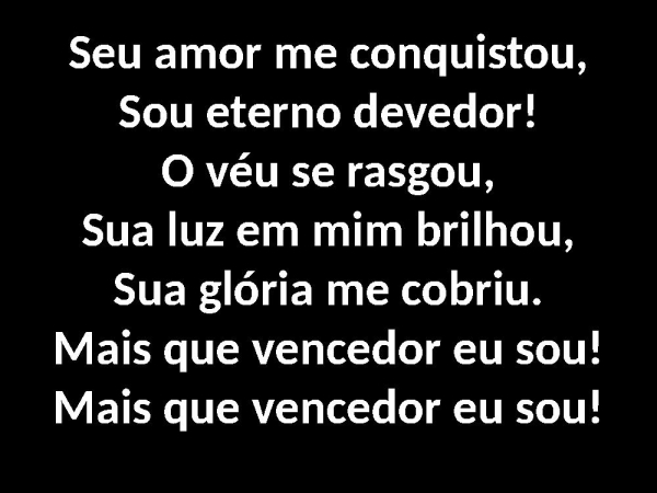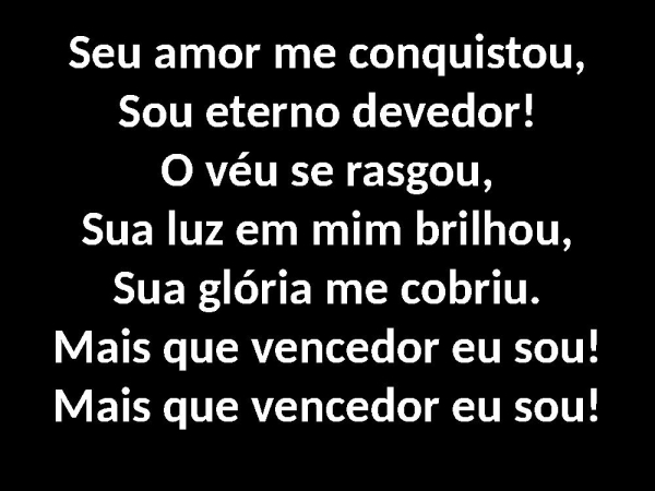- Seu amor me conquistou,Sou eterno devedor!O véu se rasgou,Sua luz em mim brilhou,Sua glória me cobriu.Mais que vencedor eu sou!Mais que vencedor eu sou!