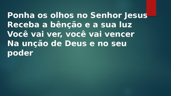 - Ponha os olhos no Senhor JesusReceba a bênção e a sua luzVocê vai ver, você vai vencerNa unção de Deus e no seu poder