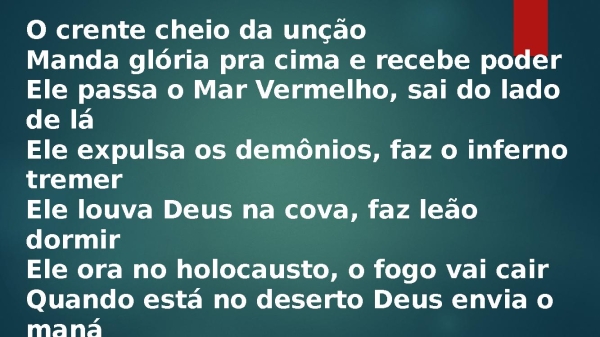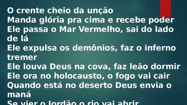 - O crente cheio da unçãoManda glória pra cima e recebe poderEle passa o Mar Vermelho, sai do lado de láEle expulsa os demônios, faz o inferno tremerEle louva Deus na cova, faz leão dormirEle ora no holocausto, o fogo vai cairQuando está no deserto Deus envia o manáSe vier o Jordão o rio vai abrirE se não abrir, vai passar por cima das águasNa unção de Deus