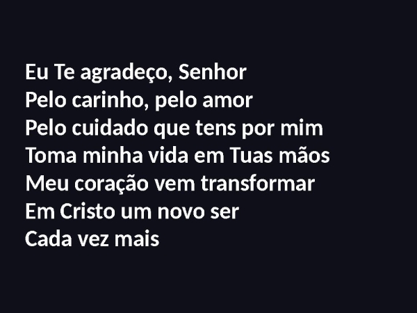 - Eu Te agradeço, SenhorPelo carinho, pelo amorPelo cuidado que tens por mimToma minha vida em Tuas mãosMeu coração vem transformarEm Cristo um novo serCada vez mais