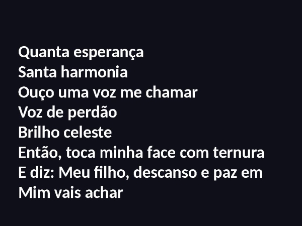 - Quanta esperançaSanta harmoniaOuço uma voz me chamarVoz de perdãoBrilho celesteEntão, toca minha face com ternuraE diz: Meu filho, descanso e paz em Mim vais achar