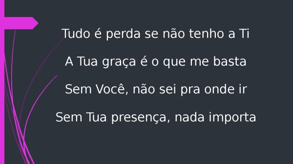 - Tudo é perda se não tenho a TiA Tua graça é o que me bastaSem Você, não sei pra onde irSem Tua presença, nada importa
