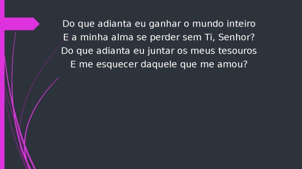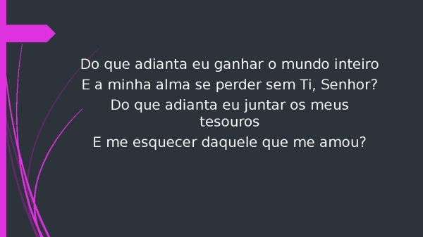 - Do que adianta eu ganhar o mundo inteiroE a minha alma se perder sem Ti, Senhor?Do que adianta eu juntar os meus tesourosE me esquecer daquele que me amou?
