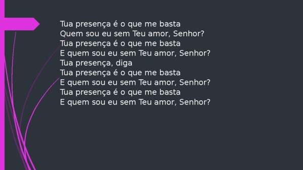- Tua presença é o que me bastaQuem sou eu sem Teu amor, Senhor?Tua presença é o que me bastaE quem sou eu sem Teu amor, Senhor?Tua presença, digaTua presença é o que me bastaE quem sou eu sem Teu amor, Senhor?Tua presença é o que me bastaE quem sou eu sem Teu amor, Senhor?