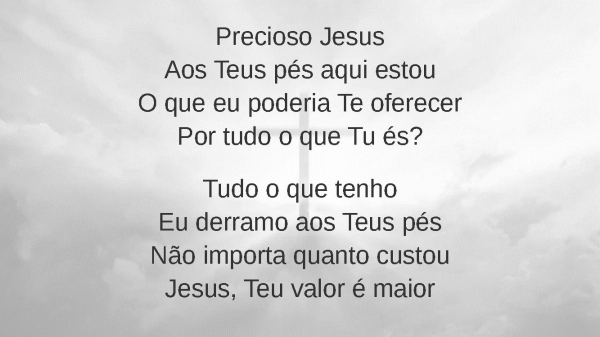 - Precioso JesusAos Teus pés aqui estouO que eu poderia Te oferecerPor tudo o que Tu és?Tudo o que tenhoEu derramo aos Teus pésNão importa quanto custouJesus, Teu valor é maior