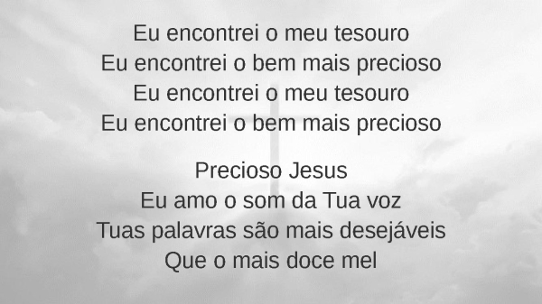 - Eu encontrei o meu tesouroEu encontrei o bem mais preciosoEu encontrei o meu tesouroEu encontrei o bem mais preciosoPrecioso JesusEu amo o som da Tua vozTuas palavras são mais desejáveisQue o mais doce mel