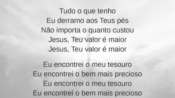 - Tudo o que tenhoEu derramo aos Teus pésNão importa o quanto custouJesus, Teu valor é maiorJesus, Teu valor é maiorEu encontrei o meu tesouroEu encontrei o bem mais preciosoEu encontrei o meu tesouroEu encontrei o bem mais precioso