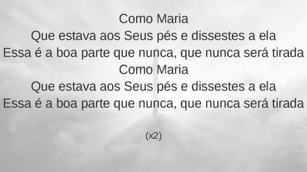- Como MariaQue estava aos Seus pés e dissestes a elaEssa é a boa parte que nunca, que nunca será tiradaComo MariaQue estava aos Seus pés e dissestes a elaEssa é a boa parte que nunca, que nunca será tirada(x2)